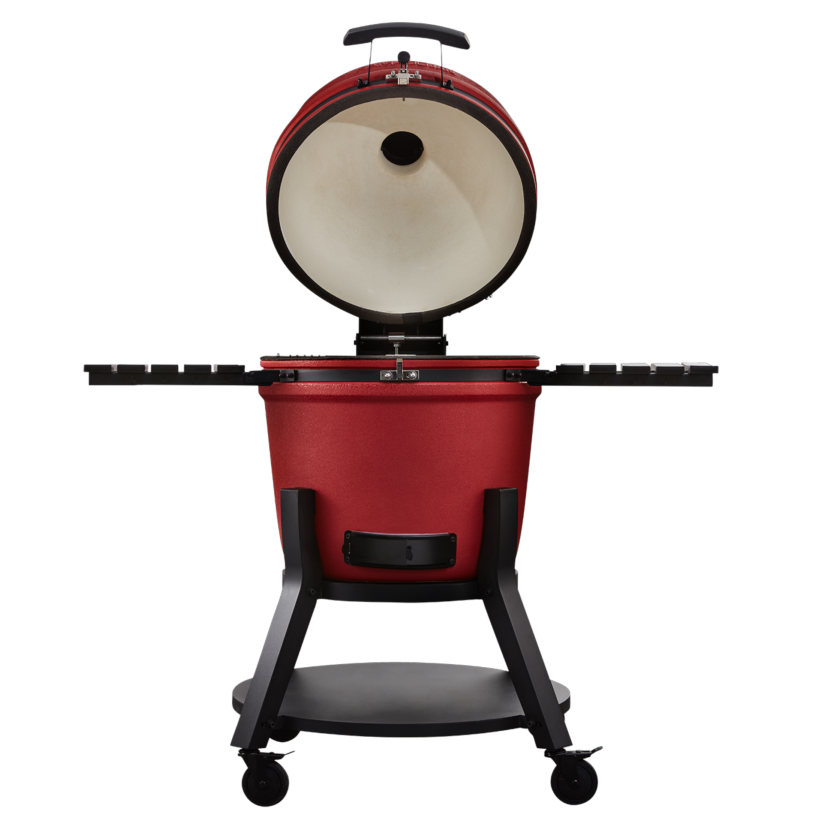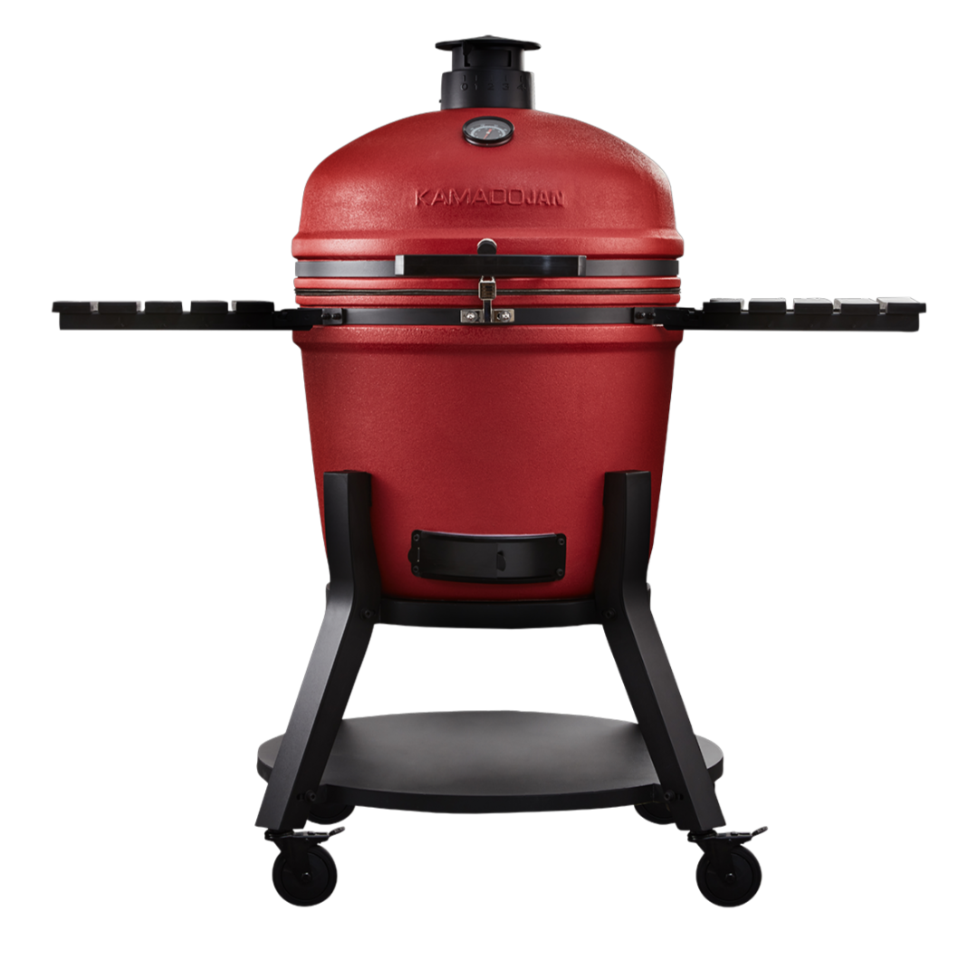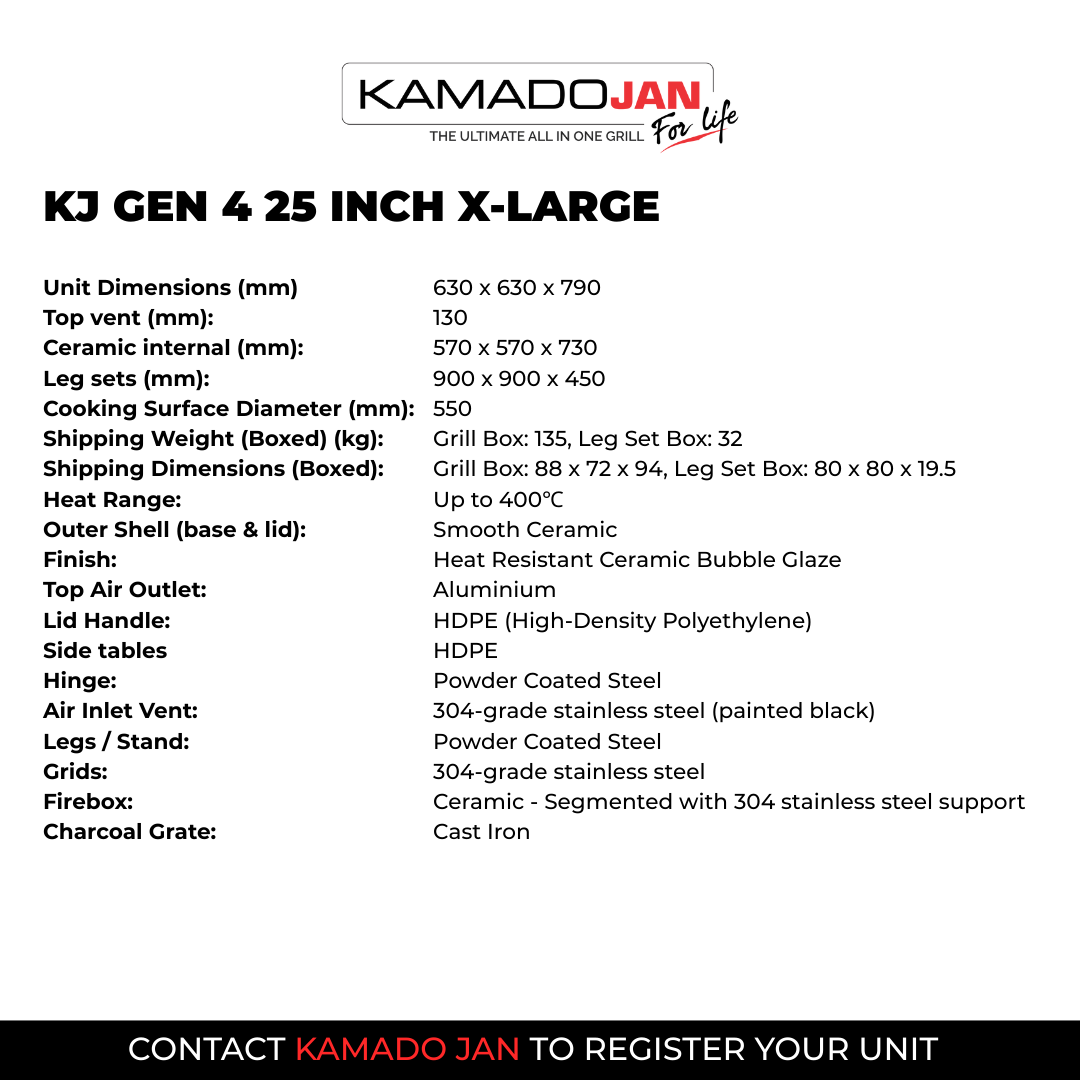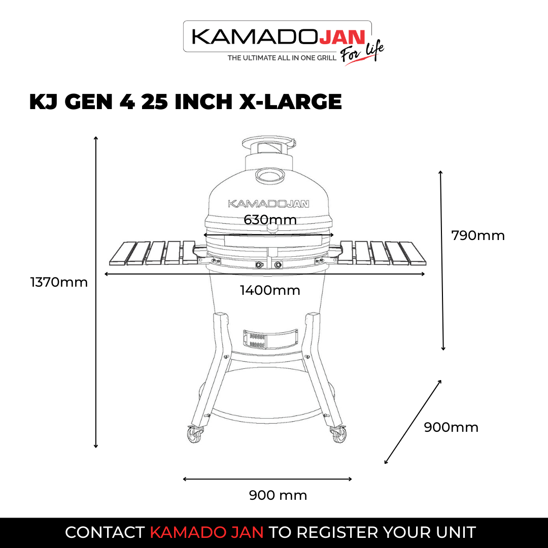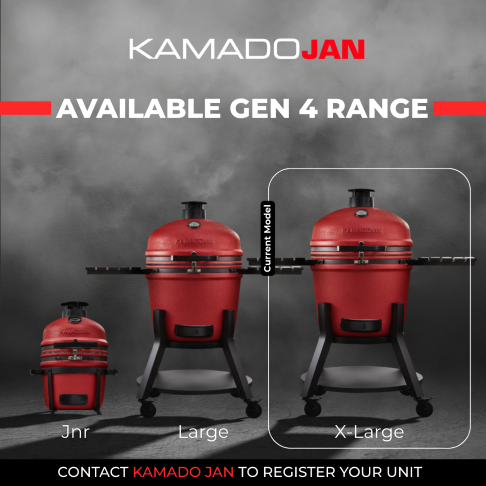 For the entertainer! Become the ultimate grill master for all your family & friends with the X-Large Kamado Jan Gen 4. Big Jan offers a 63.5cm ceramic diameter with a spacious 55cm diameter cooking surface. As on the Large model, the Divide & Conquer system is standard and allows you to create multiple heat zones thereby cooking different foods at different rates all at the same time. Although weighing in excess of 120kg, the X-Large remains very mobile thanks to the latest robust leg stand and 4 x large rubber caster wheels (2 of which are lockable). Two spacious HDPE side trays offer enough working space on either side of the grill, and built-in utensil hooks on each tray keep all your grilling tools nearby. The double-thick, mesh fiberglass gasket offers a superior air-tight seal, while the new Aero-Lift hinge makes opening and closing the ceramic lid so easy.