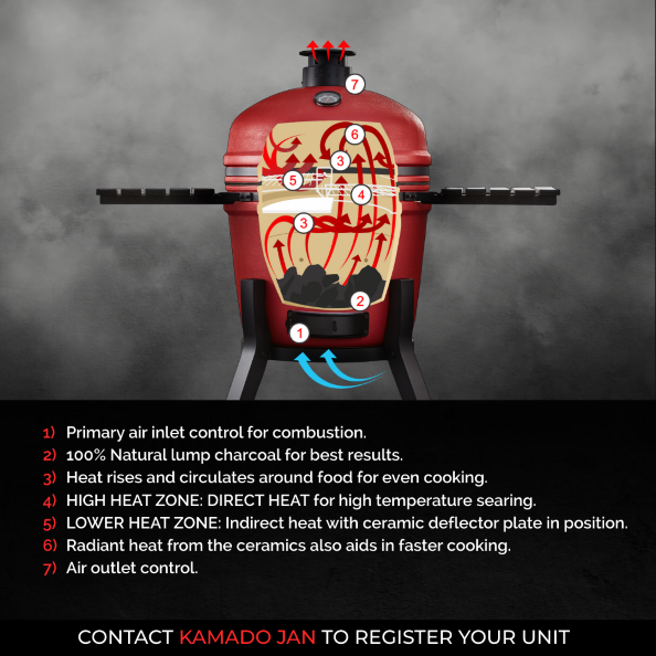 The Divide & Conquer system has been designed to give you flexibility when it comes to cooking with your Kamado JAN, offeringmore versatility than with a standard grate. The Divide & Conquer system consists of the deflector plates, half-moon grids and the multilevel frame. These components can be arranged according to your unique cooking requirements offering you flexibility and ease of use.